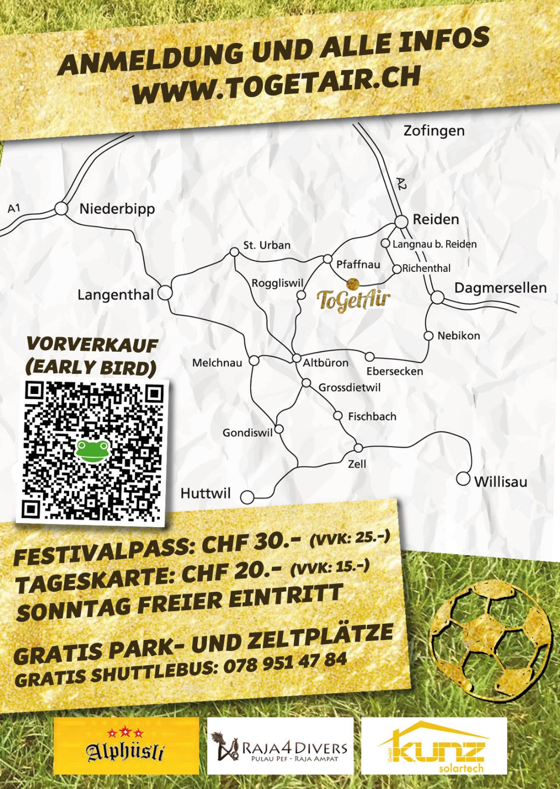 Der Kulturverein Together veranstaltet ein aussergewöhnliches Festival. Tagsüber wird Fussball gespielt und am Abend sorgen diverse Bands und DJs für ein einzigartiges Openairfeeling. Das ToGetAir mitsamt Festival-, Party- und Barbetrieb startet am Freitag Abend.